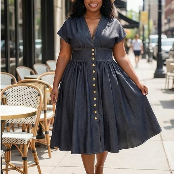 ✨ Style Statement: Embrace vintage luxury with this deep grey denim-inspired midi dress. Featuring contrast stitching and a row of gold buttons, it captures the timeless elegance of 1950s silhouettes while flattering curvy figures.