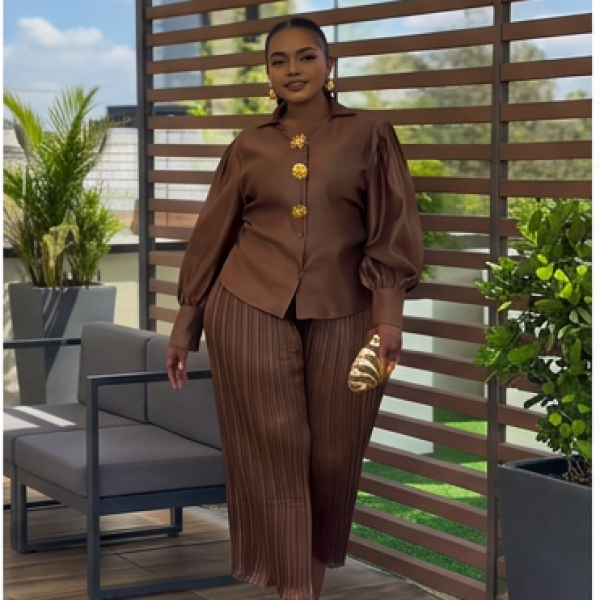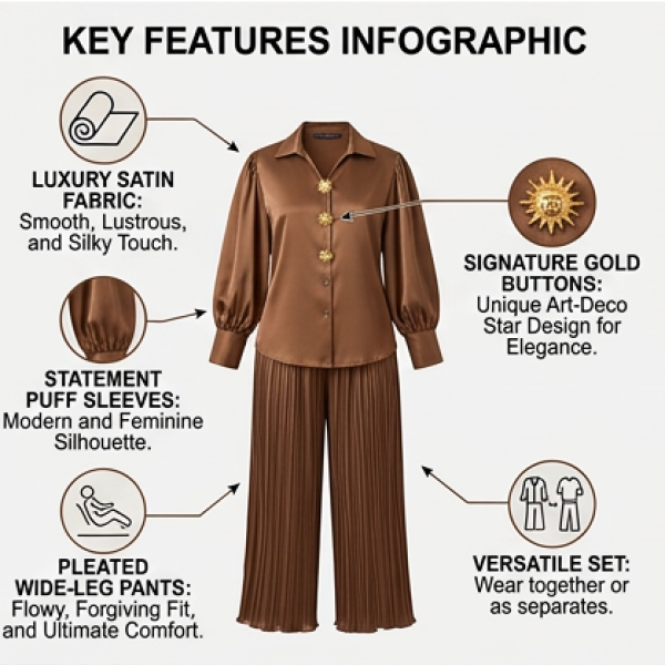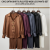 Style Statement: Elevate your everyday elegance with this luxury commuter set. The satin fabric boasts a sophisticated soft sheen, paired with flowy pleated wide leg pants for a polished yet feminine look—perfect for the office or casual social events.