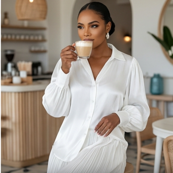 🧶 Fabric & Feel: Crafted from premium satin woven fabric, this set is silky-smooth to the touch with a gentle, luxurious luster. It’s breathable and lightweight for all-day comfort, while the pleated pants hold their structured shape beautifully without wrinkling, moving with grace as you walk.